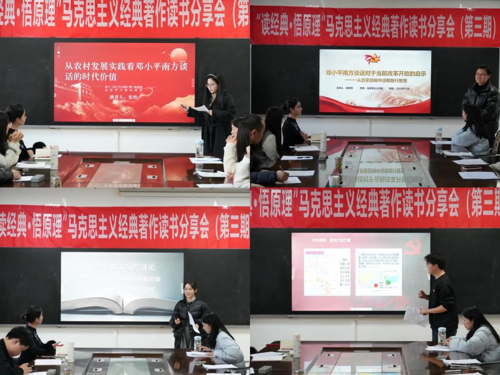 (通讯员/赵彤)12月26日下午,“读经典·悟原理”马克思主义经典著作读书分享会(第三期)在我院五楼会议室顺利举办。本期活动以《邓小平文选》第三卷为核心研读文本,特邀我院涂用凯教授担任导读嘉宾。来自不同专业的硕士研究生积极参与,围绕“南方谈话”等重要篇章,结合学科视角畅谈阅读体会,在交流中深化理论认知,展现了青年学子扎根经典、关切现实的思想自觉。