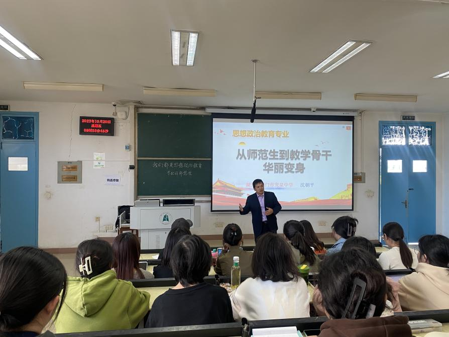 10月20日,荆门市龙泉中学沈朝平老师在教4-504为永利集团88304官网2020级政教专业全体同学“优秀教师成长”专题。本次讲座由政教系副主任胡银银主持。