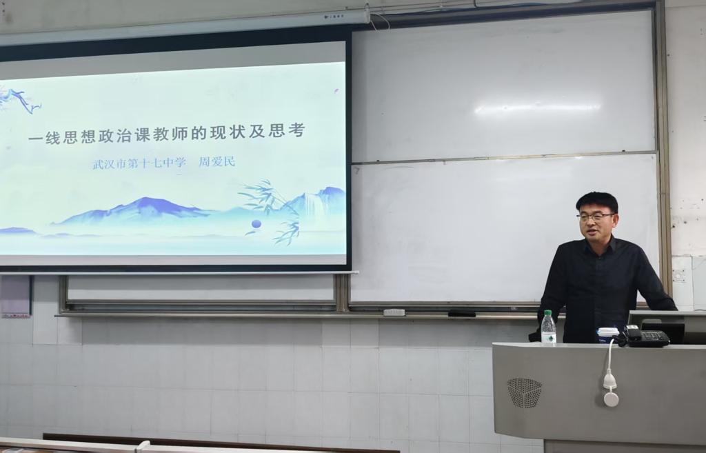 (通讯员/冯瑗、毛心甜)9月24日,为助力2023级思想政治教育(师范类)本科生提前了解中学思政教学实际,我院特邀请武汉第十七中资深教师周爱民,开展以“一线思想政治课教师的现状及思考”为主题的专题讲座。本次讲座由胡银银老师主持,2023级全体思政教育专业学生到场聆听。