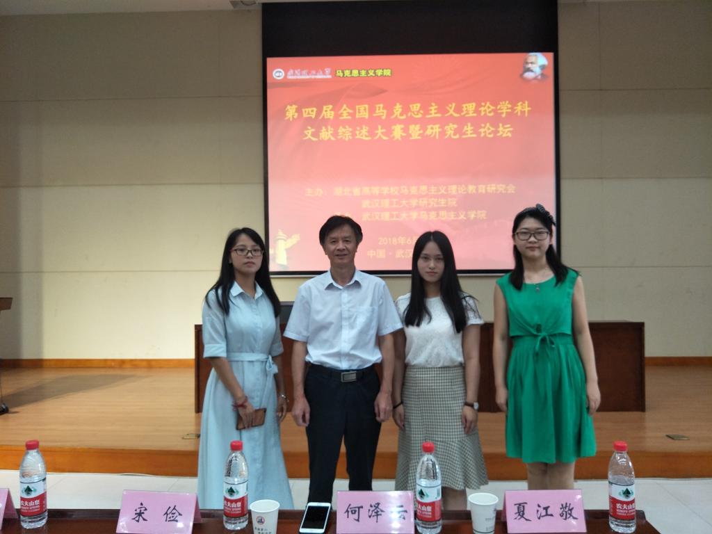 6月23日,由湖北省高等学校马克思主义理论教育研究会、武汉理工大学研究生院主办,武汉理工大学永利集团88304官网承办的第四届全国马克思主义理论学科文献综述大赛暨研究生论坛在武汉理工大学(马房山校区)顺利召开。武汉理工大学党委副书记夏江敬、湖北省教育厅思政社科处何泽云处长、湖北省高等学校马克思主义理论教育研究会秘书长李资源教授、武汉大学永利集团88304官网宋俭教授、华中师范大学永利集团88304官网院长万美容教授、华中科技大学永利集团88304官网副院长黄长义教授、我院院长徐方平教授等领导和专家应邀出席。来自清华大学、复旦大学、南京大学、厦门大学、四川大学、南昌大学等30多所高校的近100名硕士研究生和博士研究生参加。我院2017级马克思主义基本原理专业博士研究生沈钰晶,2016级思想政治教育专业硕士研究生赵璐、禹荟彩以文入会。
