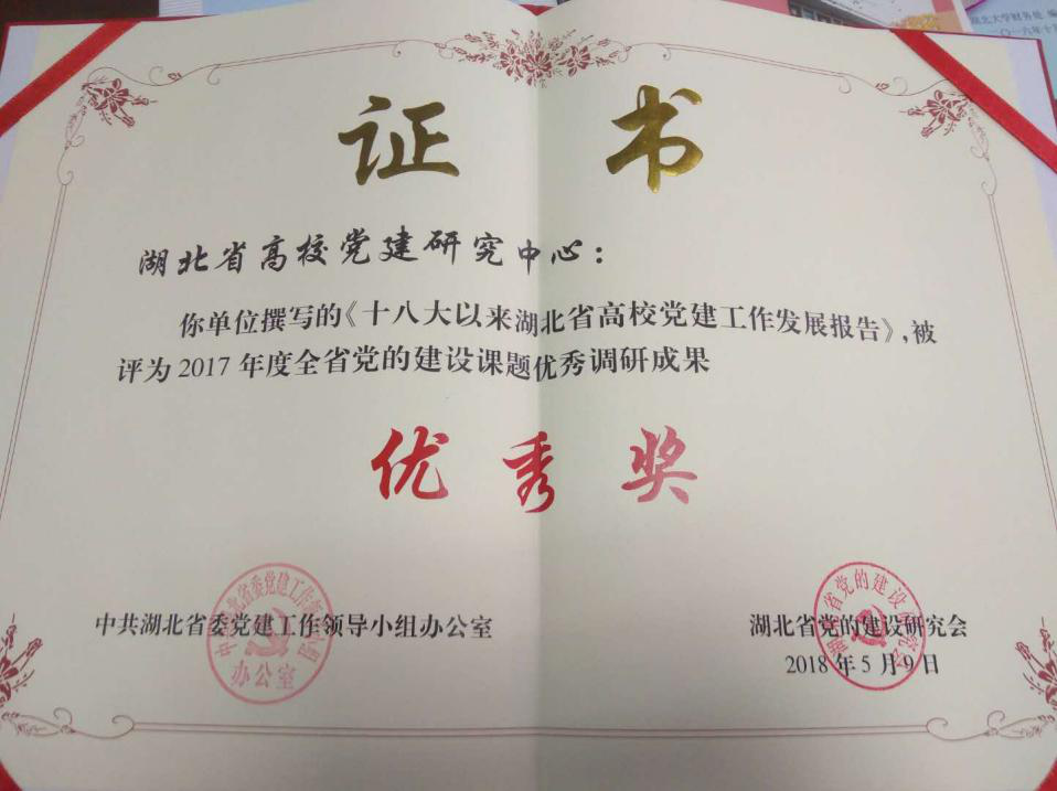 近日,湖北省委党建工作领导小组办公室、湖北省党的建设研究会表彰了2017年度全省党的建设课题优秀调研成果,由湖北省高校党建研究中心撰写的调研报告——《十八大以来湖北省高校党建工作发展报告》获调研成果优秀奖。